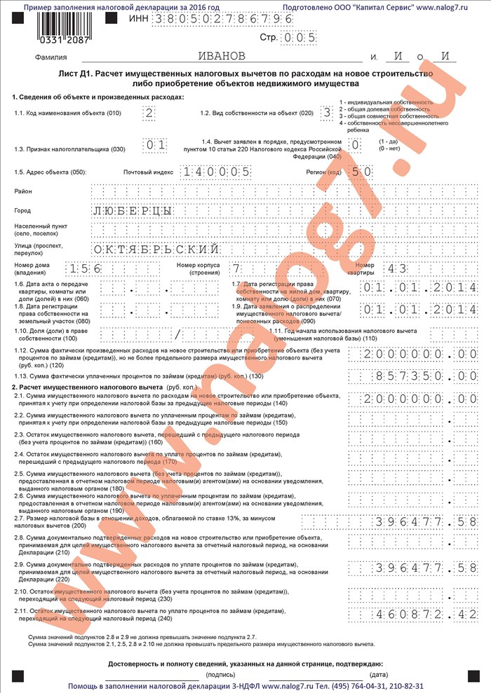 Пример заполнения налоговой декларации 3-НДФЛ за 2016 го при покупке жилья и оплате процентов по кредиту